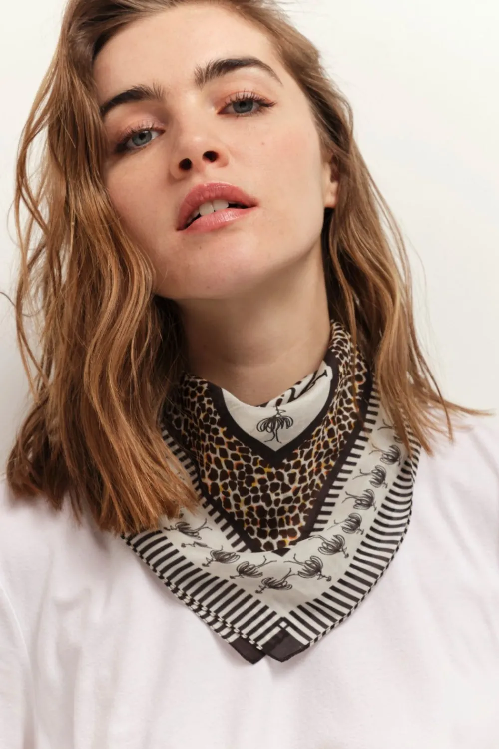 Accessoire Indispensable, Le Foulard Abrams Déploie Son Imprimé Mini Girafon Dans Les Tons Beige Et Camel, Décoré De…