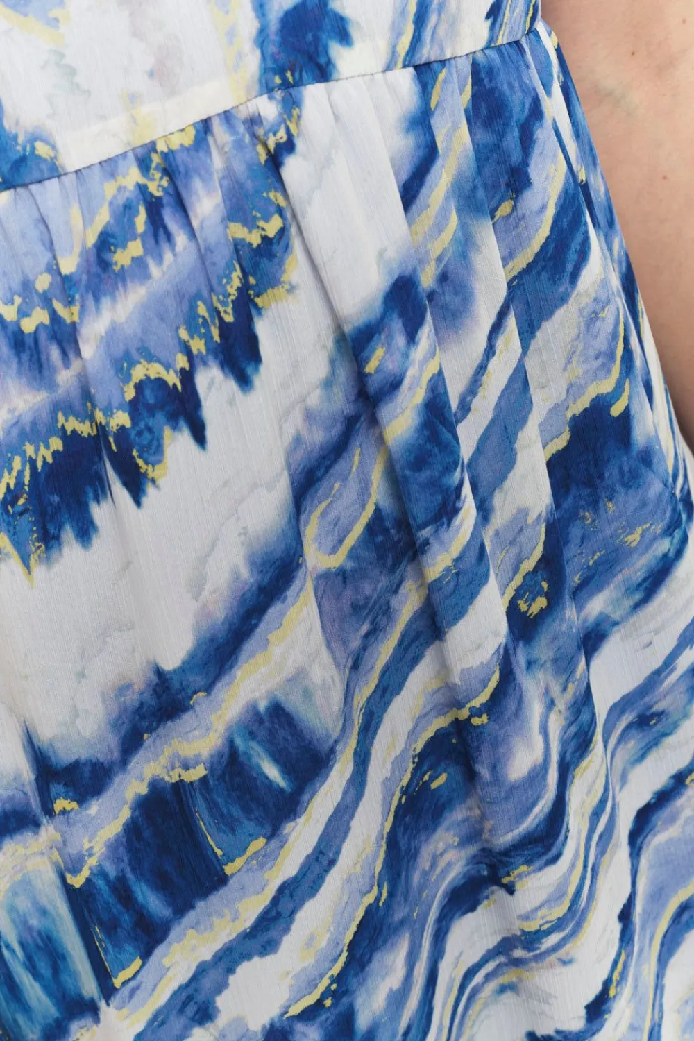 Longueur Cheville Et Fines Bretelles Pour La Robe Rikka. En Voile De Polyester Recyclé, Elle Ose Un Imprimé Vagues D’Azur Audacieux, À Dominante Estate Blue.