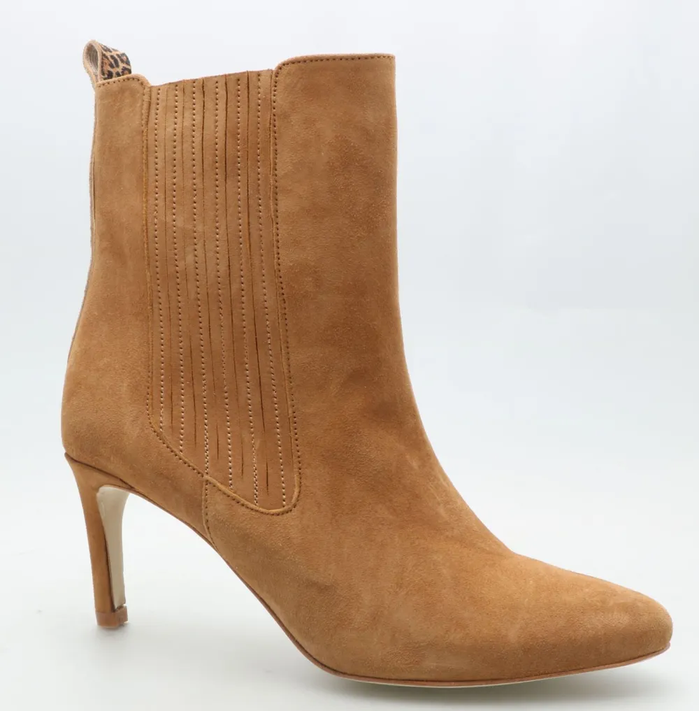 Les Chelsea Boots O.Cana Sortent De Leur Zone De Confort. En Cuir Velours Caramel, Ils Présentent Un Bout Pointu Et Un Talon Fin Recouvert De 7,5 Cm. Tout Comme Les Élastiques Latéraux, Avec Découpes Cousues. Son Atout Mode ? Un Galon À Motif Léopard Placé Sur Le Contrefort.
