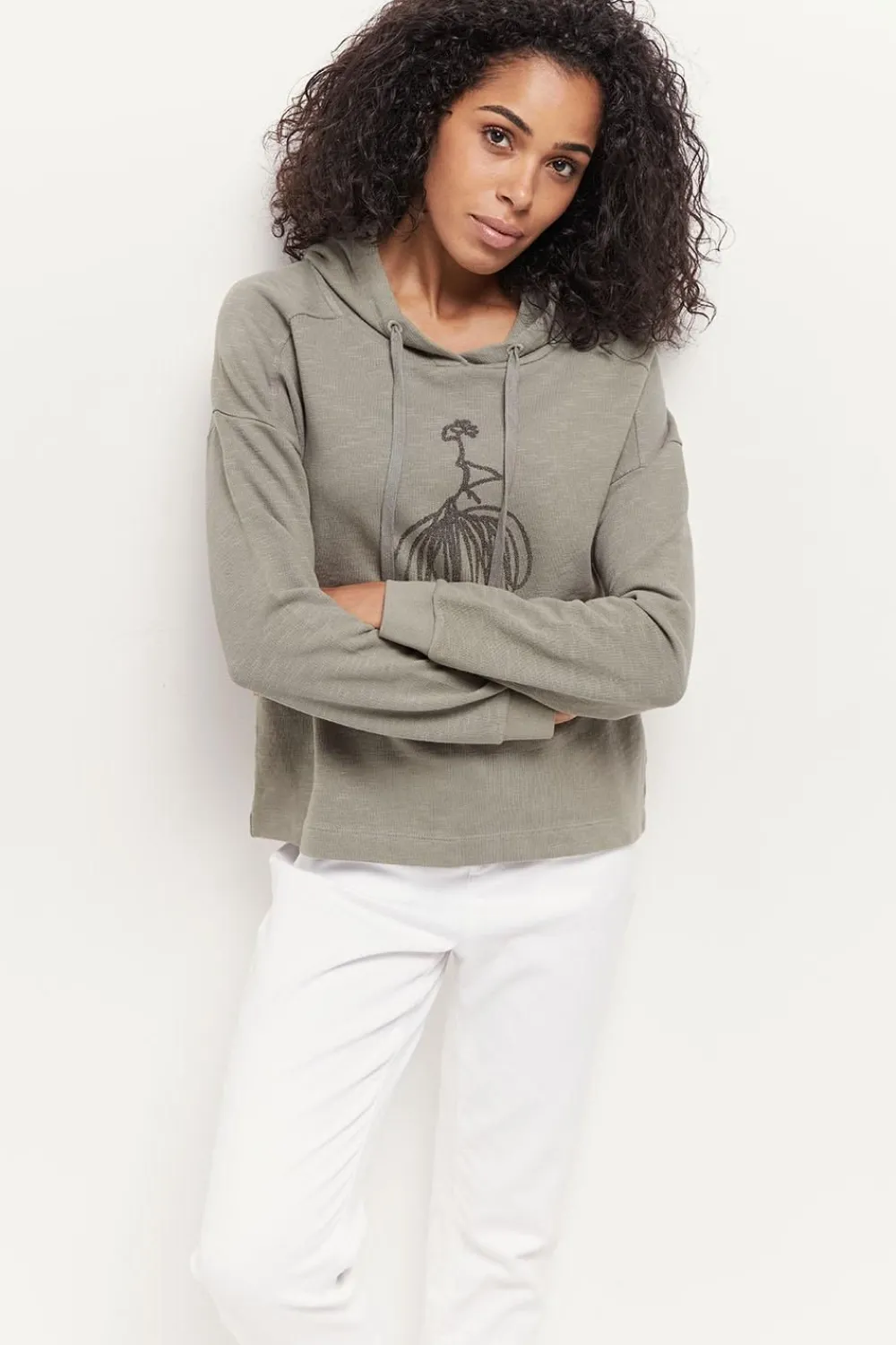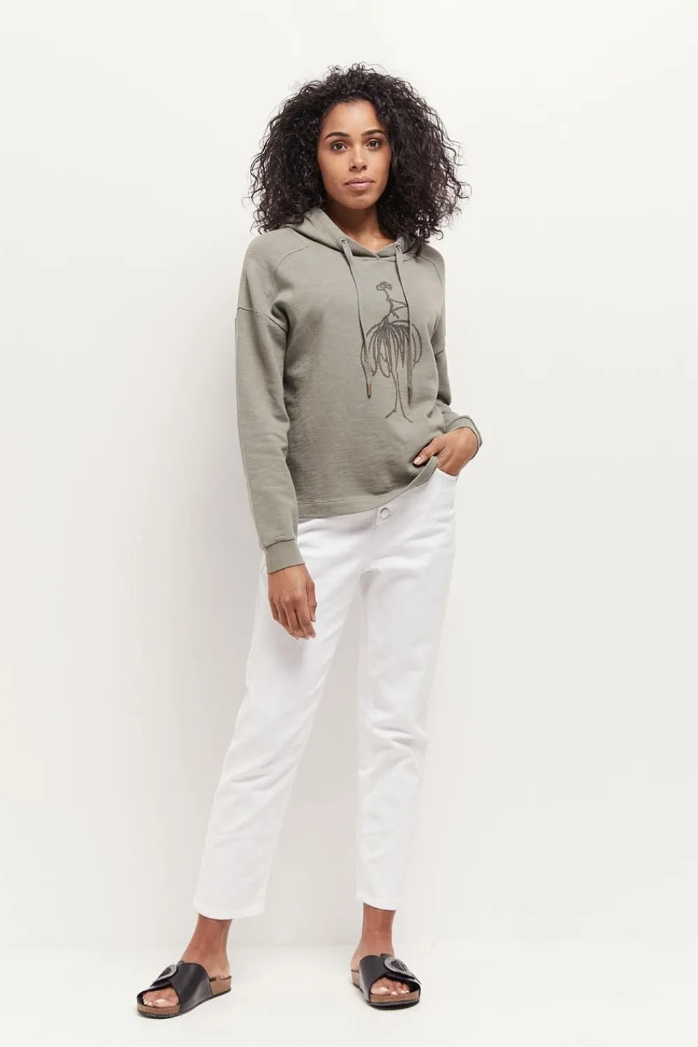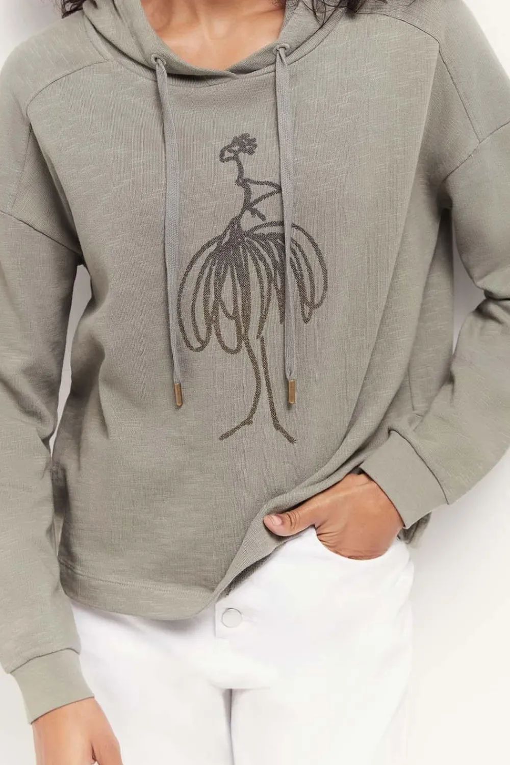Dans La Famille Casual, Demandez Le Sweat Maori. En Molleton Flammé Vétiver, Entre Le Kaki Et Le Gris, Il Gagne En Décontraction Par Sa Capuche Avec Cordons, Et En Style, Par Son Visuel De Danseuse En Flocage Gomme Pailleté Placé Devant.