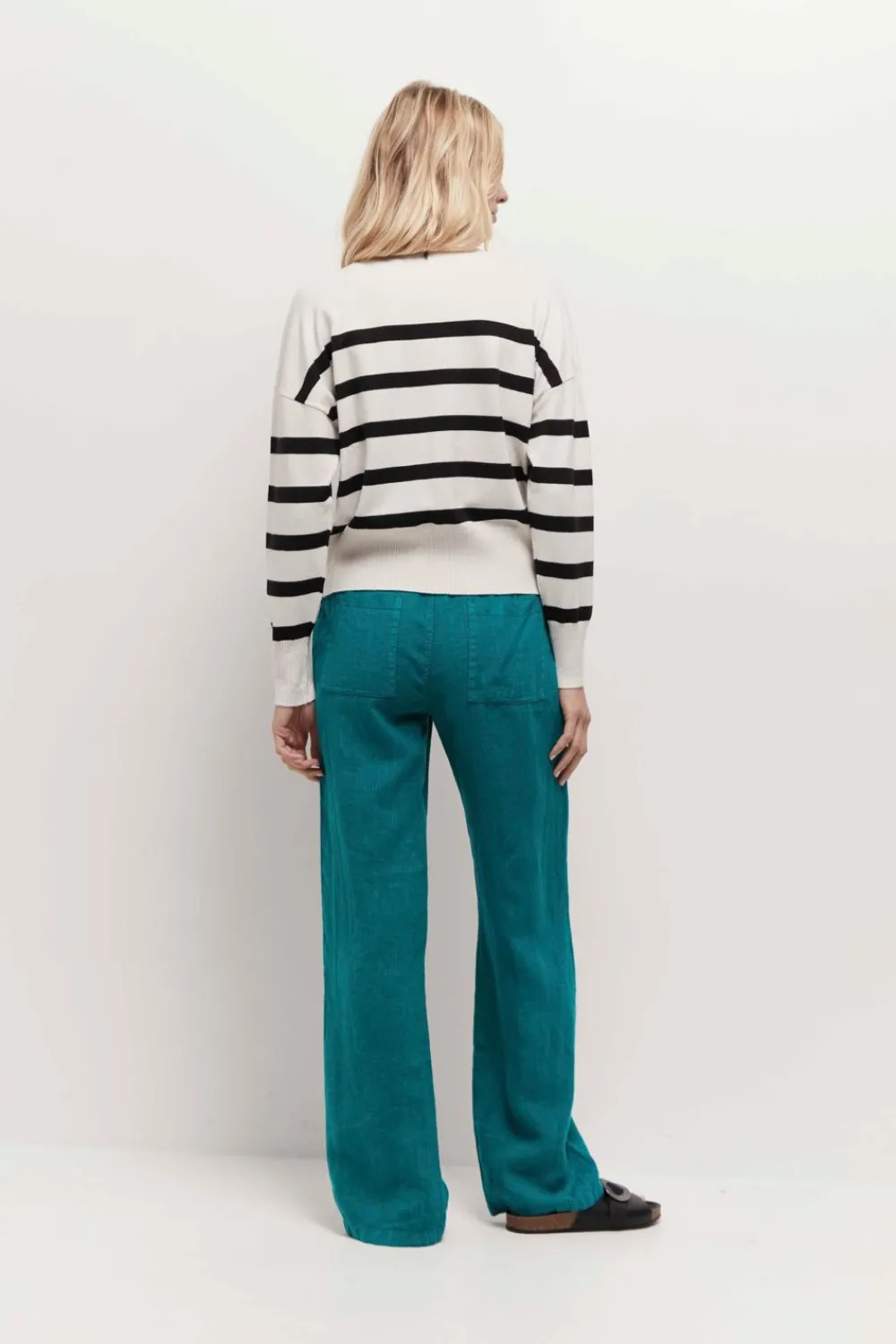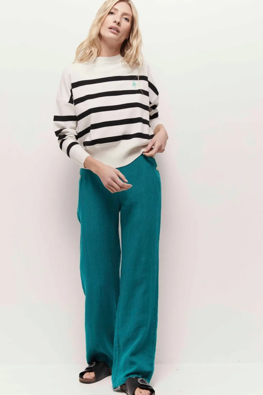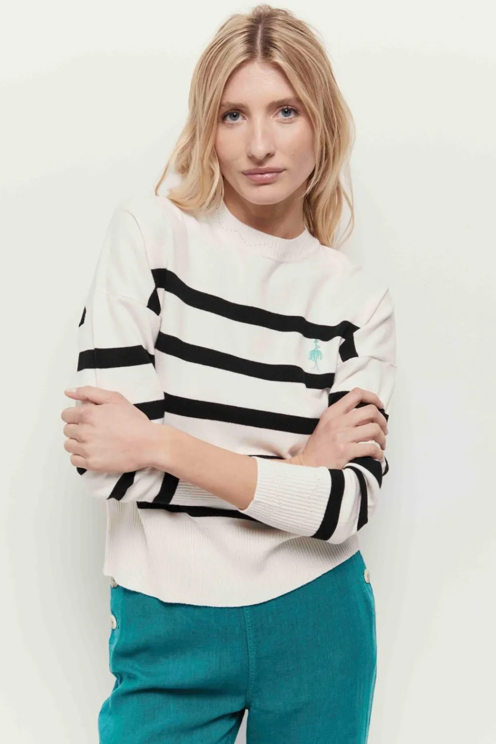 Passion Rayures. Passion Marinière. Passion Titana, Qui Revisite Cette Pièce Iconique, En Version Tricotivoire Et Noir, Avec Col Montant, Bords-Côtes Fantaisie Et Broderie Danseuse Sur La Poitrine.