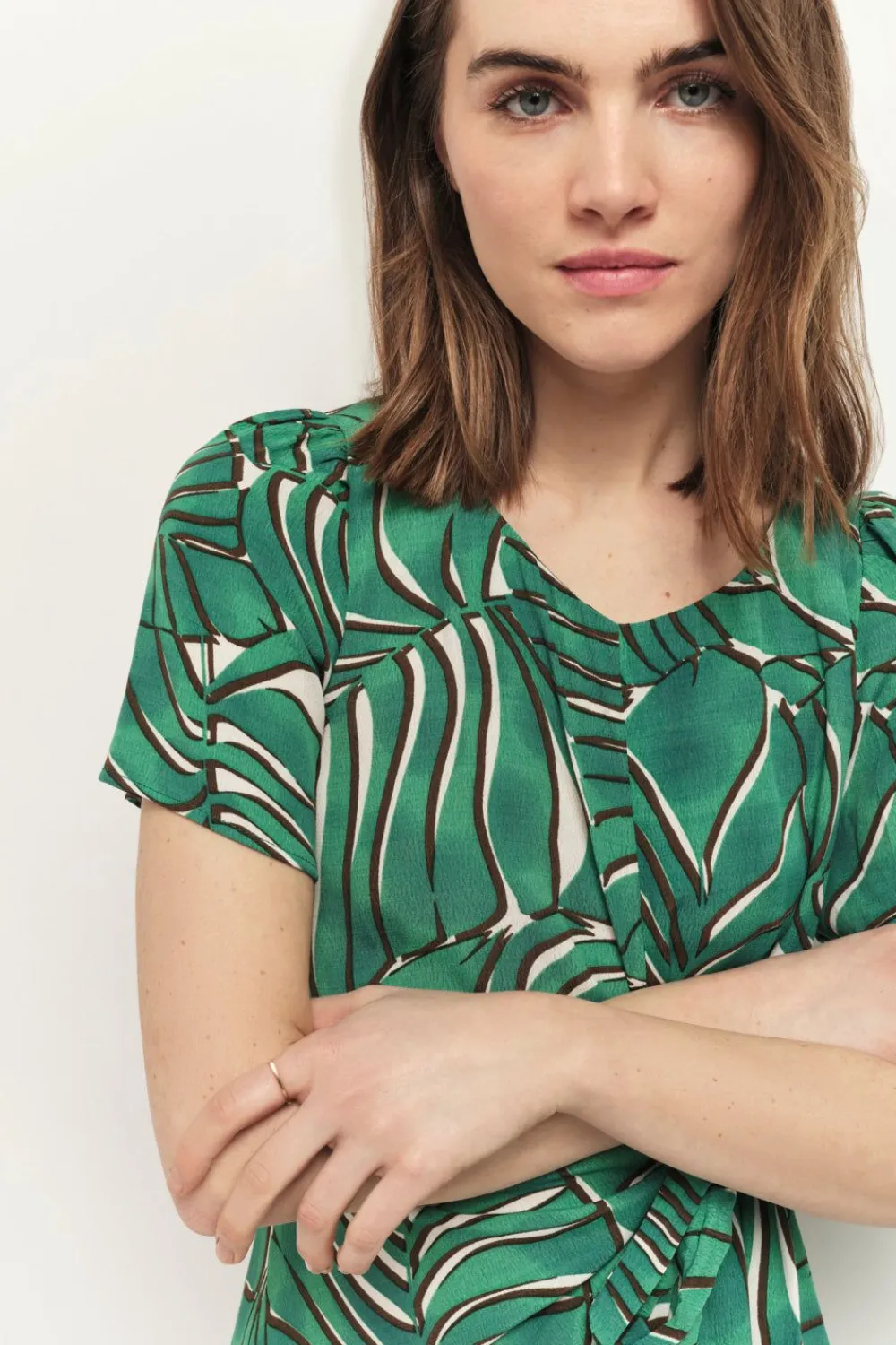 La Robe Rami Marque Sa Singularité Par Sa Forme Évasée, Soulignée D’Un Effet Drapé Devant Et Dos, Grâce À Une Ceinture Fixe À Nouer Sur Le Côté. L’Imprimé Palmes Arty Exclusif Sublime Le Twill De Viscose.
