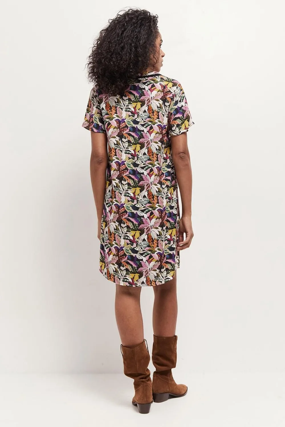 L’Imprimé Jungle Bigarré Exclusif, Ou Comment Revisiter La Tendance Aventurière Avec Féminité. Sur La Robe Reko, Les Couleurs Osent Des Associations De Kaki Et Violine, Camel, Blanc Et Jaune, Parfaitement Orchestrées. Au Dos, L’Encolure Est Soulignée D’Une Ganse Ajourée.