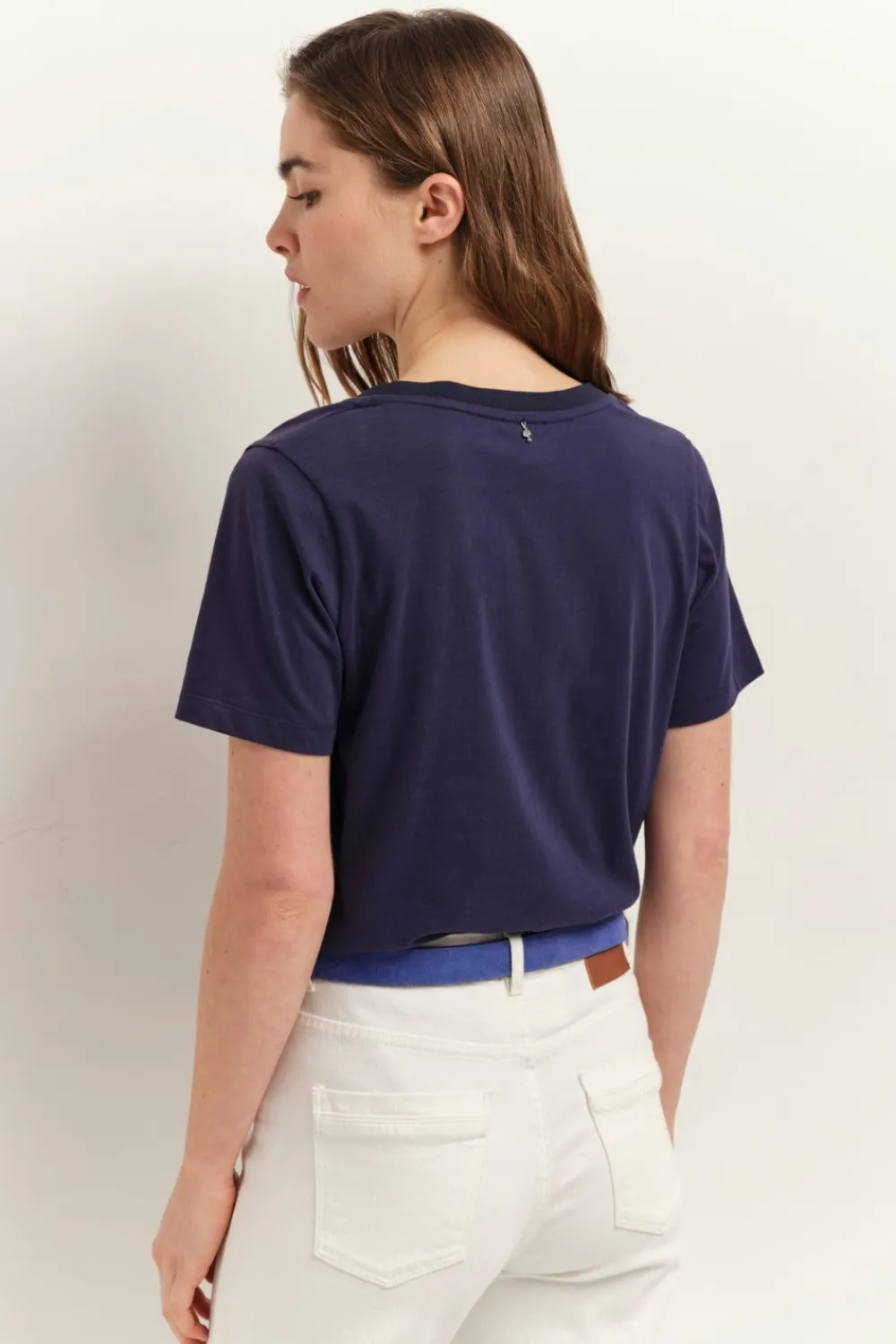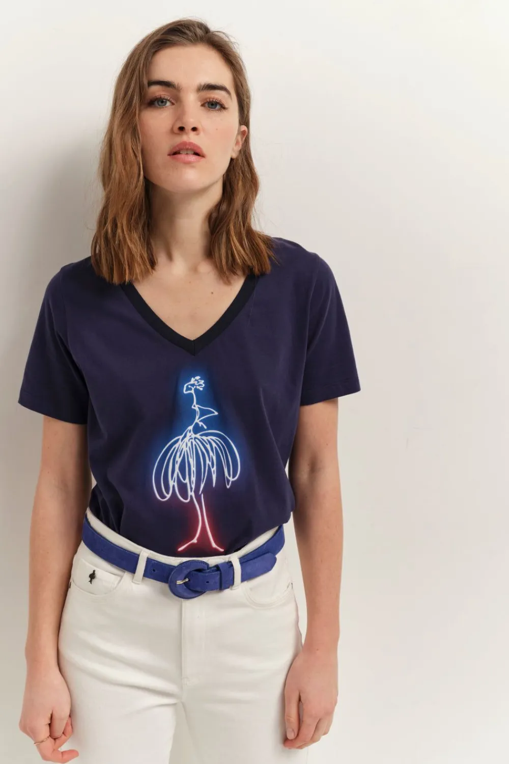 Notre Danseuse Emblématique N’En Finit Pas De Se Réinventer. La Preuve Sur Le T-Shirt Madian, En Coton Bio Coloris Estate Blue, Proche Du Marine, Animé D’Un Visuel Danseuse Futuriste Exclusif En Gomme, Avec Effet Lumière, Dessiné Par One Step.