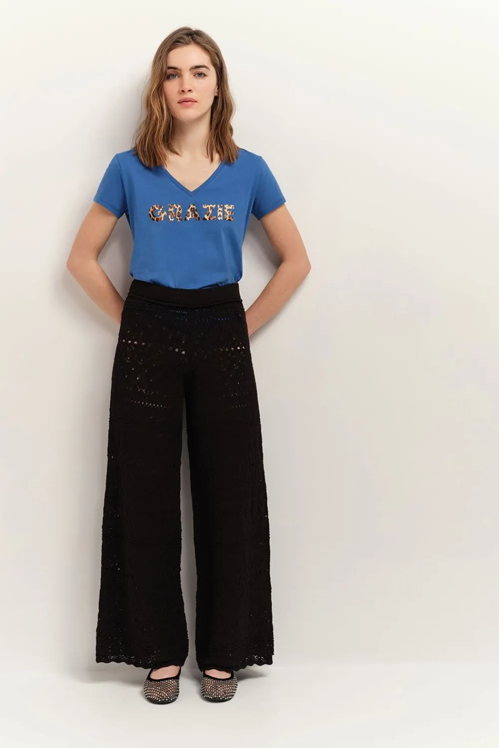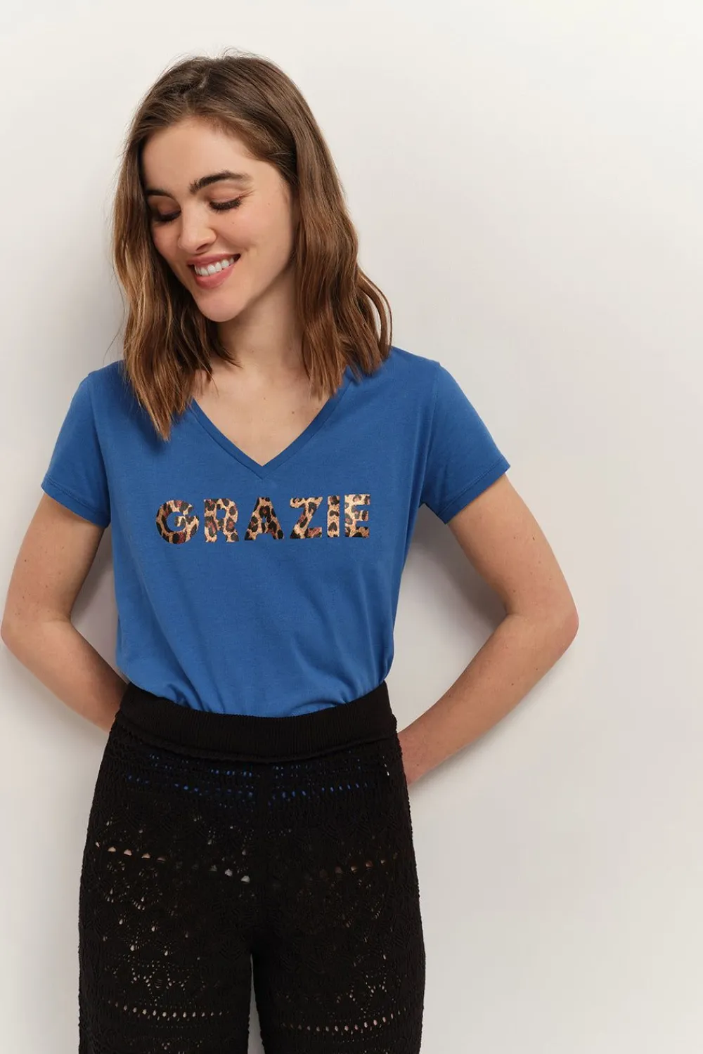 Grazie Signifie Merci En Italien. Une Sérigraphie Placée À Motif Léopard Métallisée, Qui Bouscule Le T-Shirt Mica En Coton Coloris Santorin Blue, Issu De L’Agriculture Biologique.